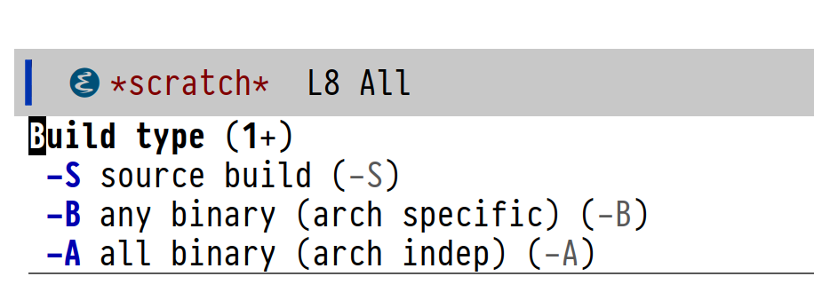 Let's start building a transient "prefix", which more-or-less corresponds to the menu popup itself, that lets us set the build type. There are basically three kinds of builds: